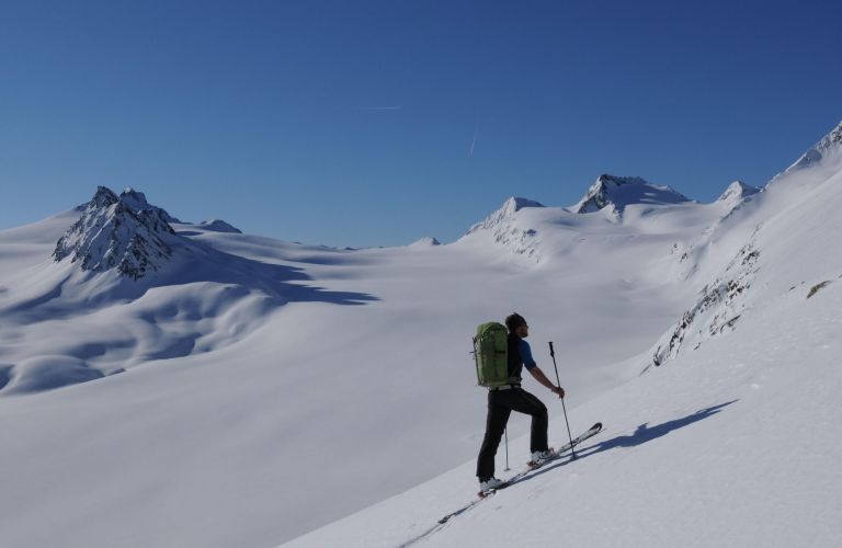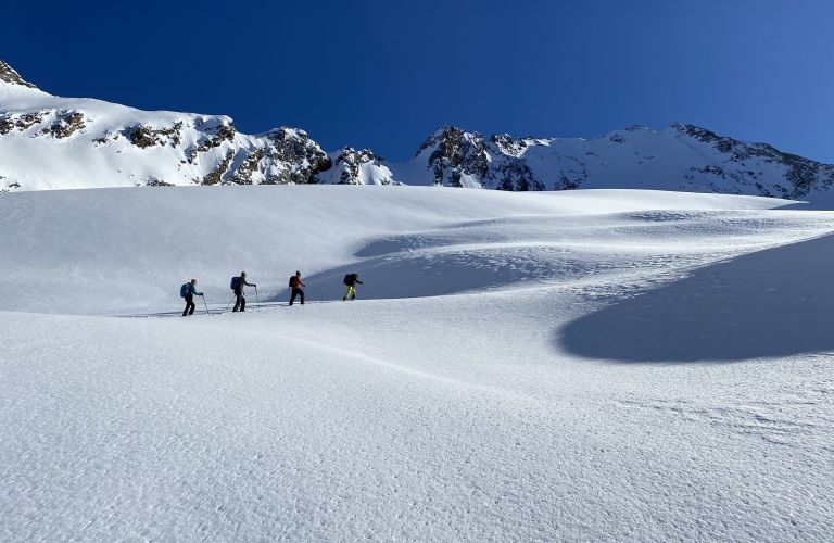 After an introduction to the correct use of equipment and tips on clothing, packing your rucksack and heat management, we set off. The selected route is determined according to the conditions. The mountain guide will give you valuable tips on walking technique so that you learn how to move efficiently and master the first hairpin bends. After a well-earned break on the summit, the reward for the ascent follows: we enjoy the incomparable feeling of powder snow on the descent.